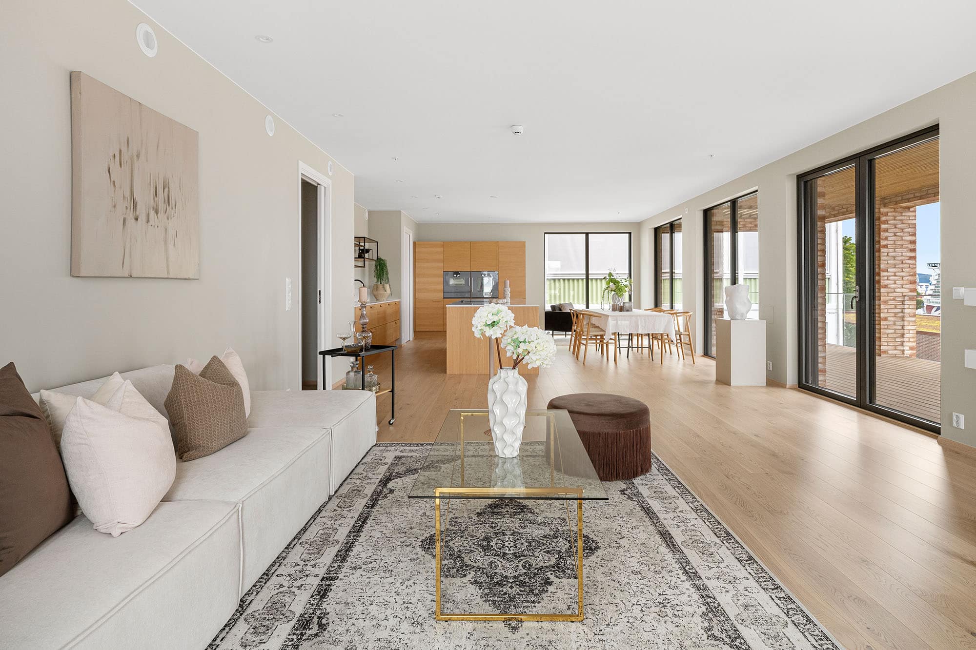 Leilighet på 147 m² med spektakulær 33 m² balkong. To soverom, to bad og walk-in garderobe i omkledningsrom. El-peis og kvalitetskjøkken fra Svane kjøkken med hvitevarer fra Gaggenau gir luksuriøs komfort.
