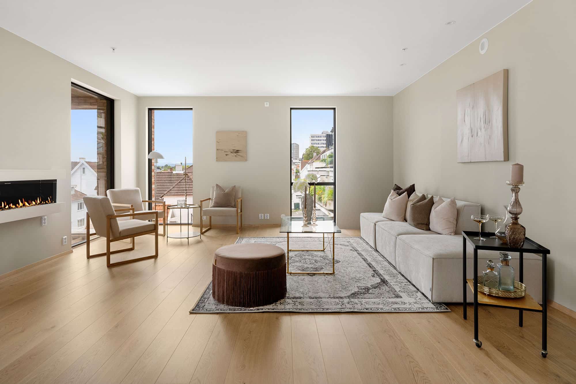 Premium+ leiligheter leveres med vannbåren varme, innvendig el-peis, hvitevarepakke fra Gaggenau og walk-in garderober i omkledningsrom.